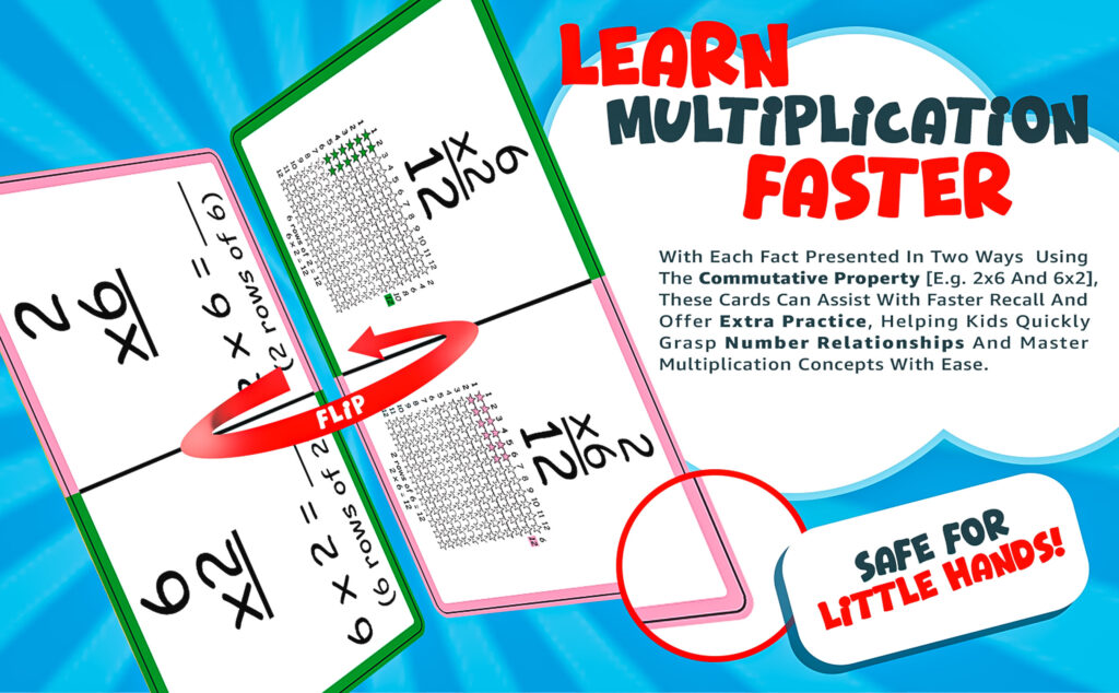 - MASTER MULTIPLICATION FASTER – By presenting each fact in two ways through the use of the Commutative Property of Multiplication [e.g. 4×6 and 6×4], students can quickly recognize the relationship between numbers and understand multiplication concepts easily.