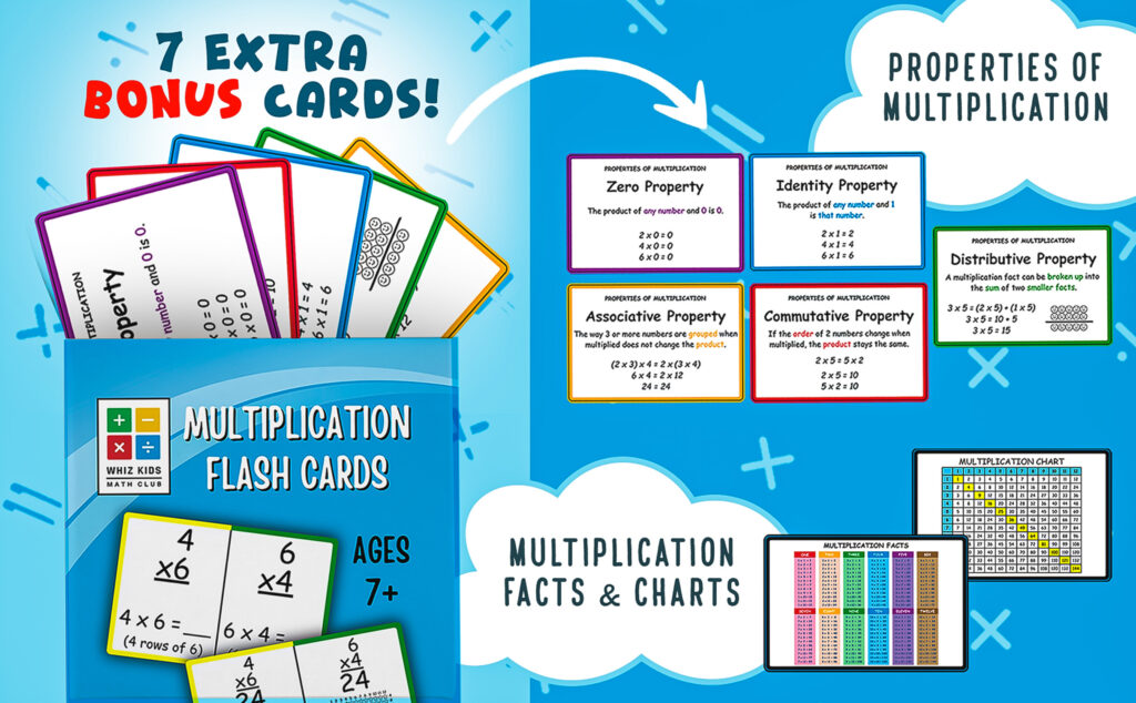 - DURABLE, JUMBO-SIZED FLASHCARDS WITH BONUS TOOLS – Printed on sturdy 6″x4″ cardstock, these jumbo-sized cards are easy to handle and built to last. The vibrant, engaging design captures kids’ attention while learning. Plus, the set includes extra cards featuring the 5 Properties of Multiplication and two quick-reference multiplication charts to reinforce concepts and support faster learning.